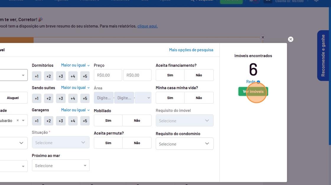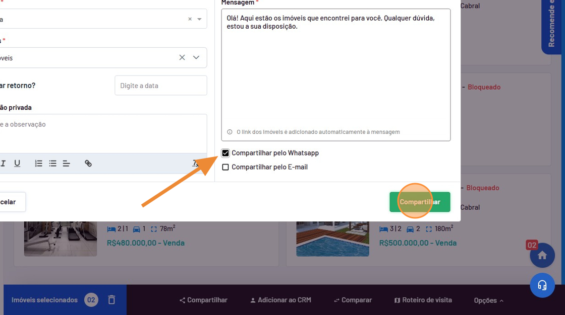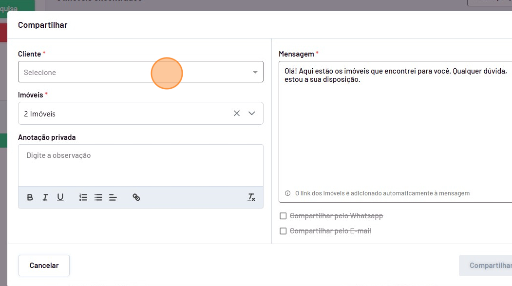 - Selecione o cliente que deseja compartilhar os imóveis.
