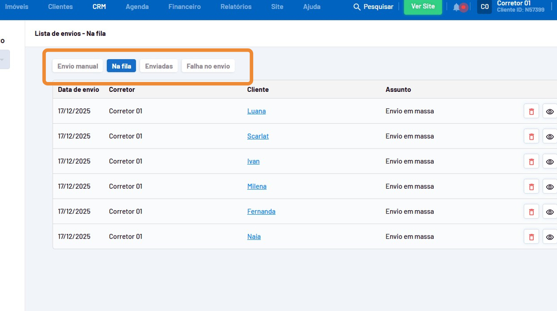 - Você poderá acompanhar os envios que estão na fila, enviadas e os que deram falha no envio.