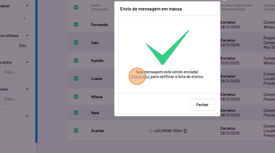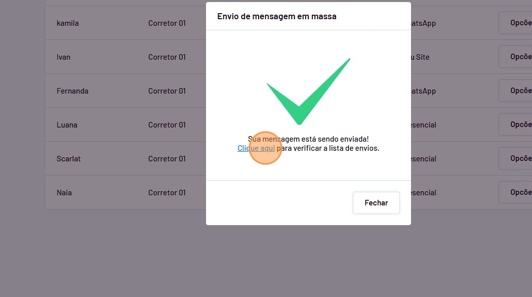 - O envio foi feito e você poderá acompanhar a lista de mensagens enviadas clicando no ícone indicado.