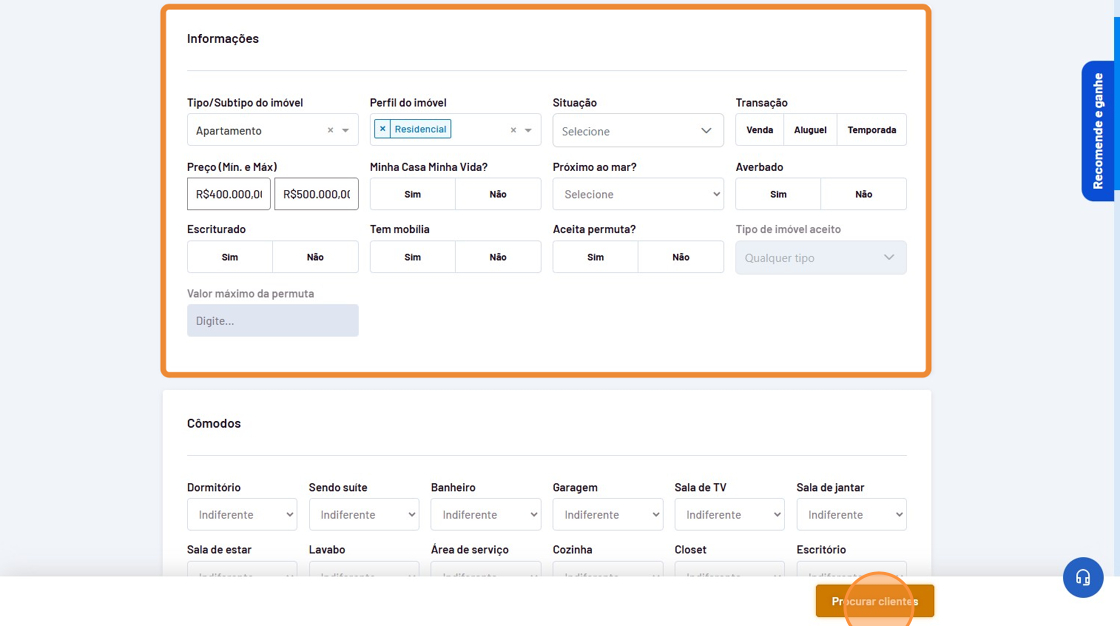 - Adicione todas as informações do imóvel para verificar se possui clientes compatíveis.
