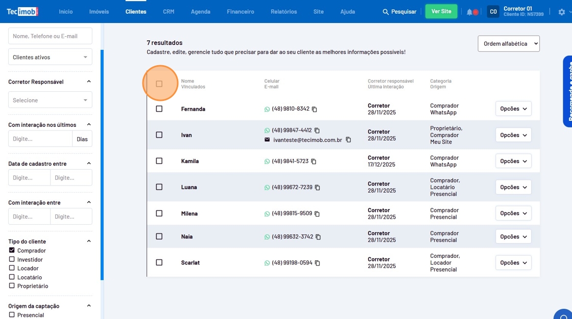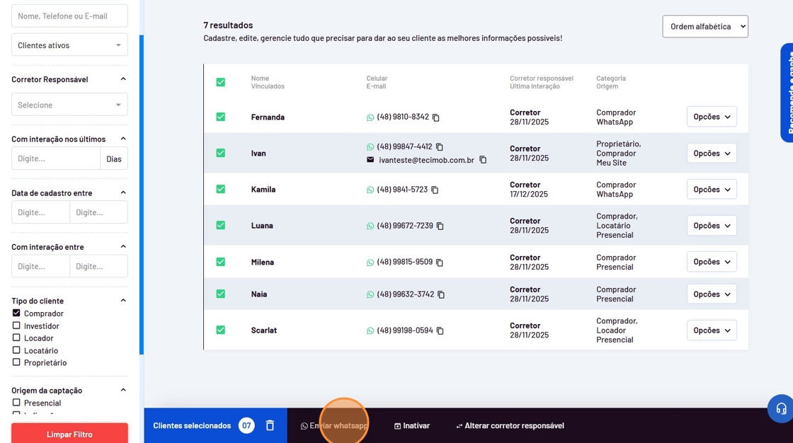 - Selecione todos os clientes ao mesmo tempo clicando na primeira caixinha de seleção ou selecione apenas os clientes que desejar.