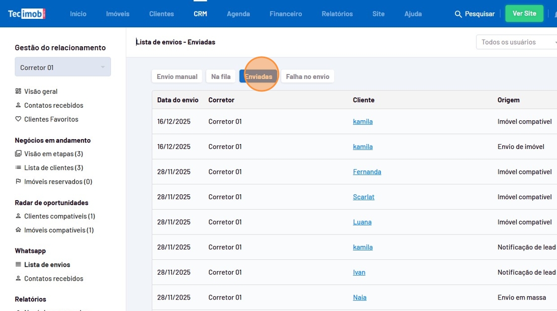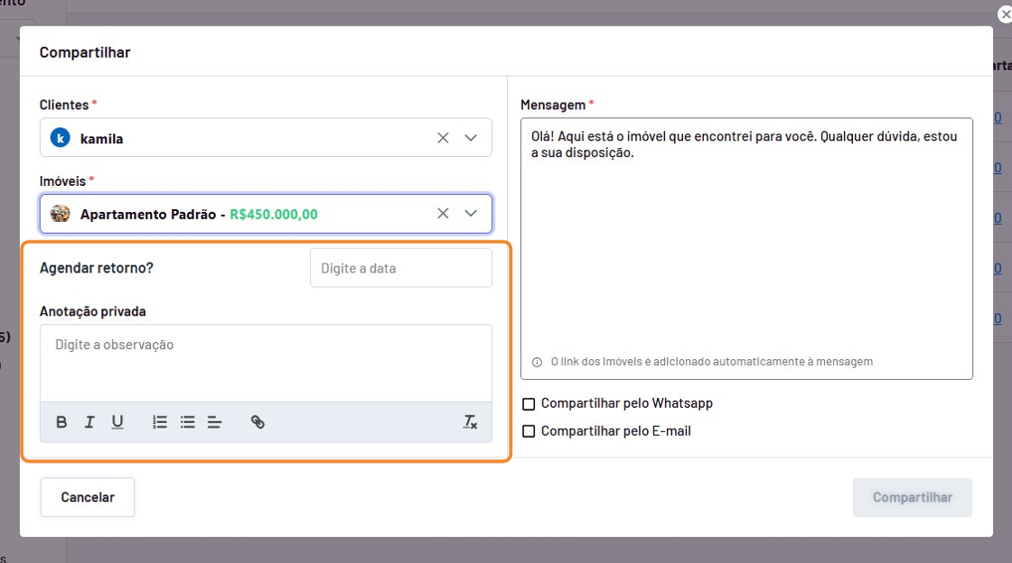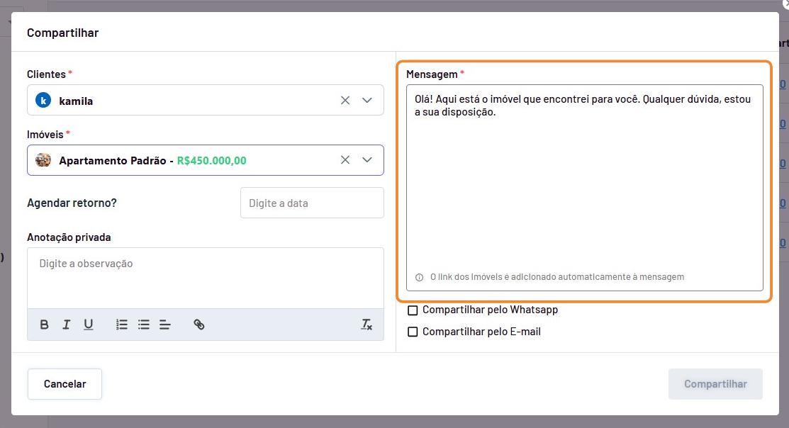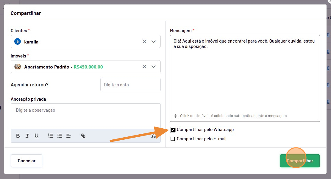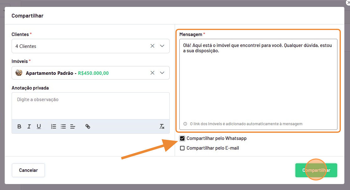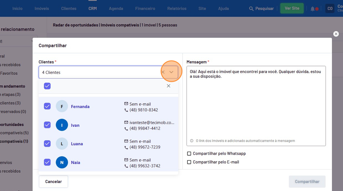 - Verifique se deseja compatilhar o imóvel para todos os clientes ao mesmo tempo ou selecione apenas os clientes que deseja enviar.