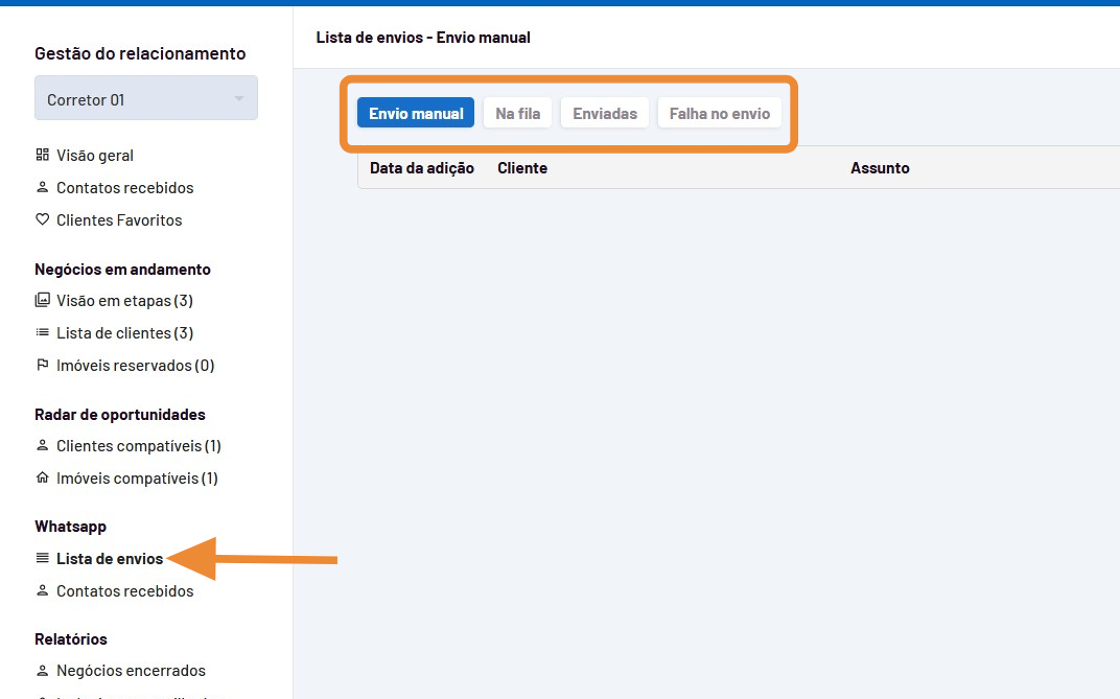 - Em "lista de envios" você tem opção de visualizar os envios manuais:
