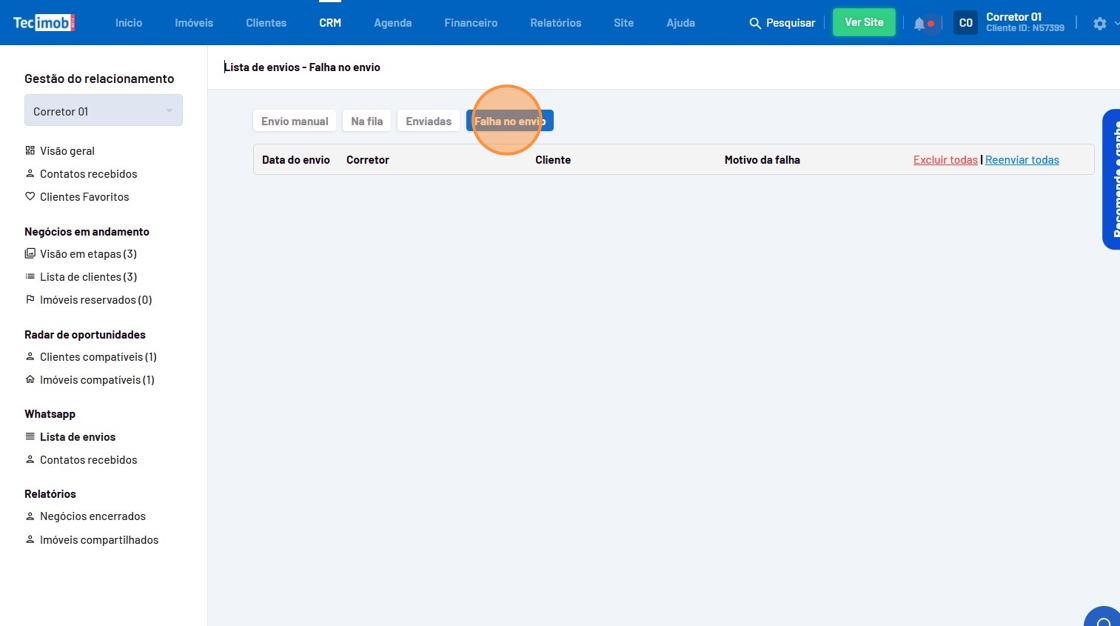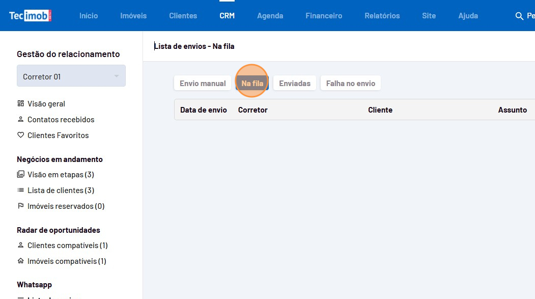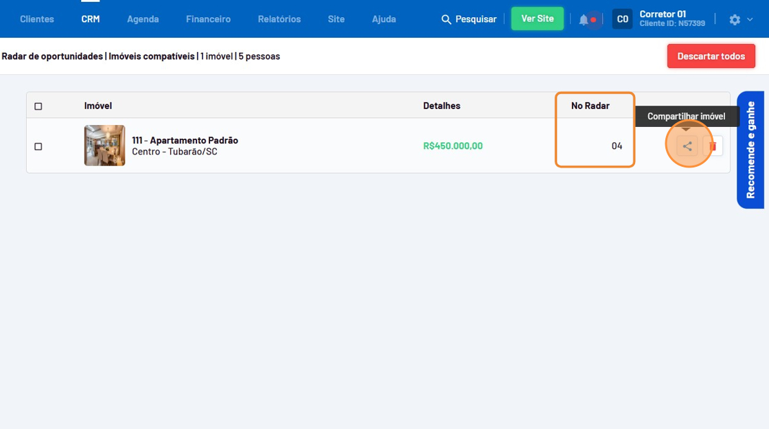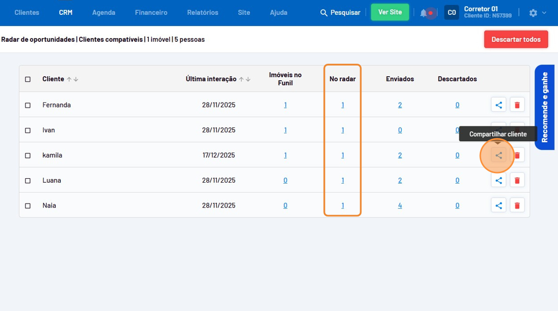 - Confira os clientes que são compatíveis com o imóvel na coluna "No Radar" e clique no ícone de compatilhamento.