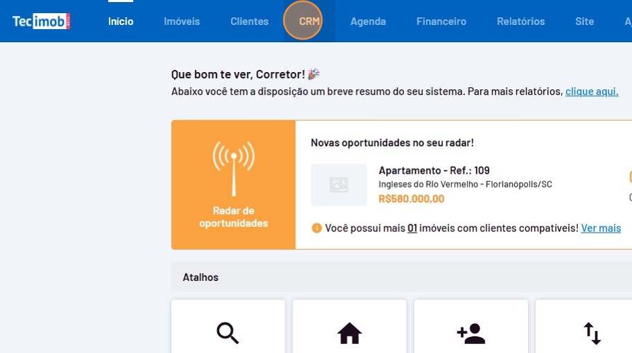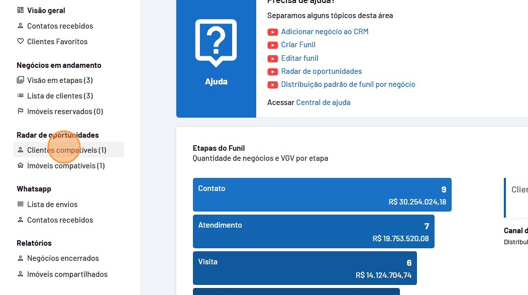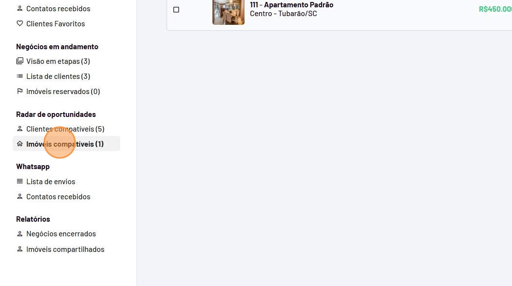 - Na coluna "No radar" é possível visualizar a quantidade e quais imóveis são compátíveis com seu cliente.