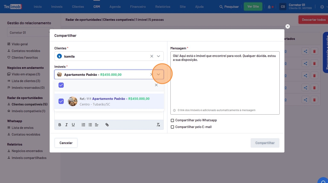 Para compartilhar os imóveis com os clientes no Radar de Oportunidades, siga estes passos: