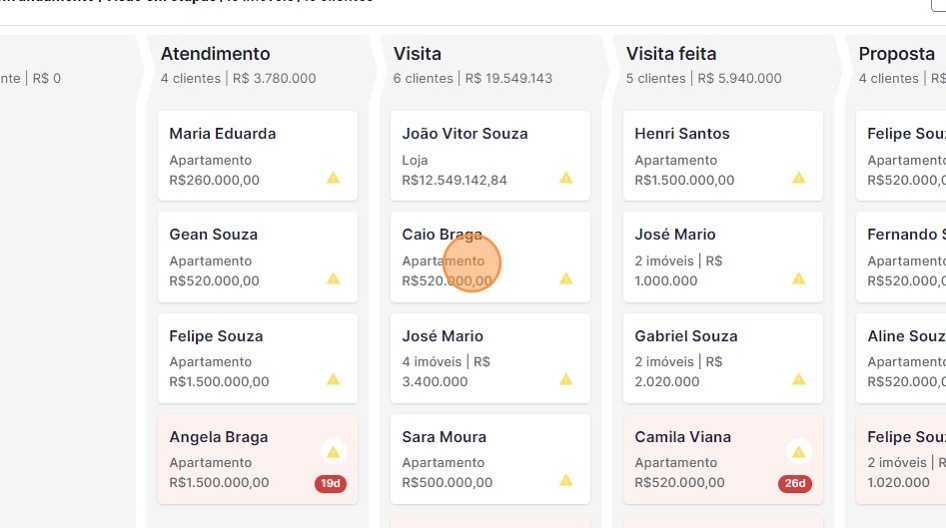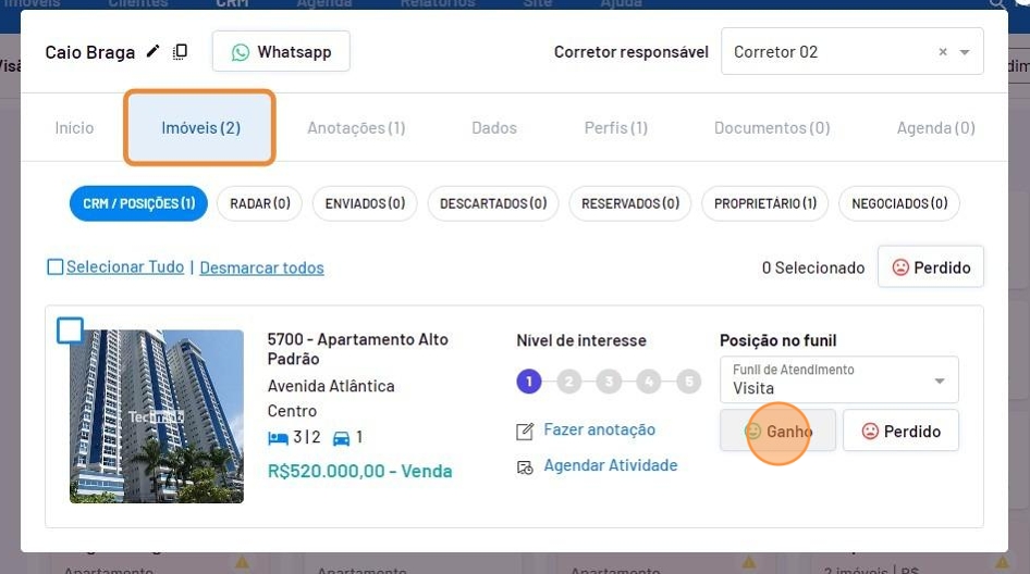 - Será aberto a ficha do cliente na etapa "Imóveis", e então clique em "Ganho" na negociação.