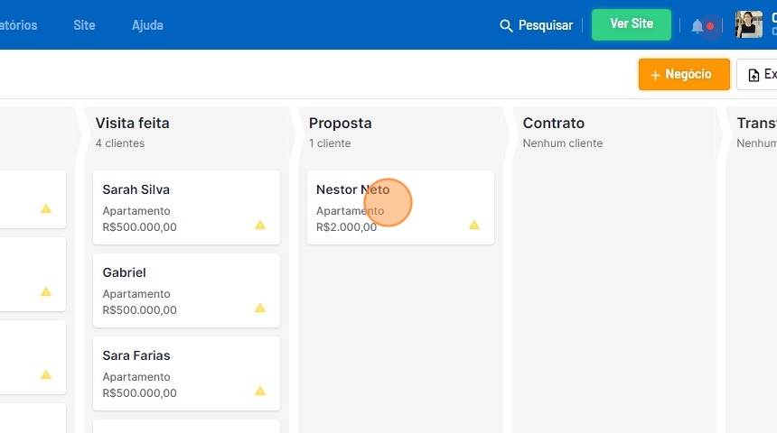- Caso o imóvel for de aluguel siga os mesmo passos, clique na negociação, será aberto a ficha do cliente e clique em "Ganho".