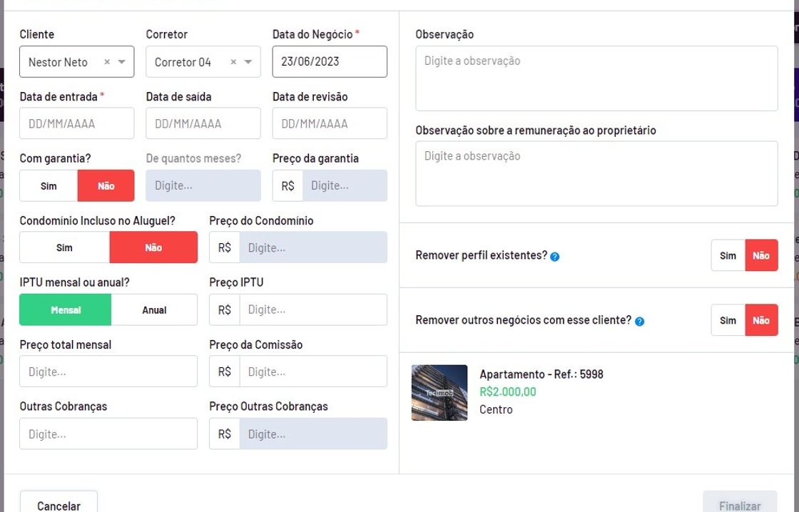 - Preencha as informações como data de fechamento do negócio, data de entrada do inquilino, data de saída (para manutenção da data apenas), data de revisão e demais informações do aluguel.
