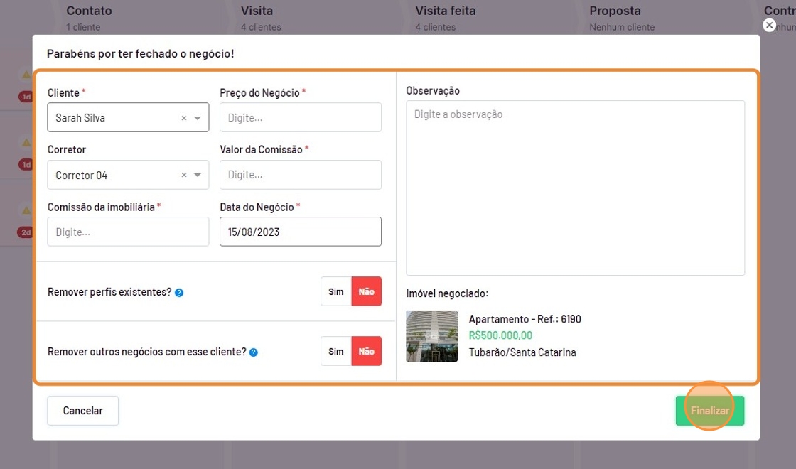 - Defina o preço do negócio, corretor responsável, comissões do corretor e da imobiliária e a data de fechamento do negócio.